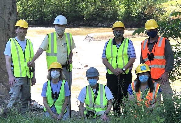 The Board of Friends of the Crooked River in front of the canal diversion dam as it was being removed, June 2020. Left to right: John Kaminski, Elaine Marsh, Gary Whidden, Harold Marsh, Keith Riley, Jacki Zevenbergen, and Ken Schneider. Photo courtesy Dianne Sumego